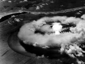 The B-29 which was to carry the A-bomb flew over us and dropped a dummy smoke bomb which exploded over the battleship Nevada. All seemed in order, so we returned to the lagoon and resumed our regular position. When not busily engaged in preparation for the test, we were given 'shore liberty' on Bikini Island. There, one could purchase 'Crossroads Tavern' chits, each good for a coke or a 3.2 beer. We also swam in the lagoon and discovered we shared it with several hammerhead sharks, perhaps five or six feet long, who didn't bother us - and we didn't bother them. Us Electronic Technicians had access to fire control directors, turret-like structures that housed optical and radar range finding equipment. The directors were electrically coupled to the gun turrets so that, when the connection was made, the gun turrets would point in the same direction as the directors. It didn't take long for us to discover that the optical range finders were excellent telescopes that were ideal for viewing the nurses who were sunbathing on the decks of the Haven, the Task Force's hospital ship. Before long, someone (a nurse) noticed that all the directors in the lagoon pointed that way. The word was soon passed to stop the viewing. Letters from home arrived in batches and mail calls were eagerly anticipated. One letter from a special girl is particularly remembered. I had taken my most recent batch to a secluded spot on deck and was in the middle of reading it when a gust of wind blew it out of my hands and overboard, just as I was getting to the most interesting part! Test Able July 1, 1946 The Big Day The following is a direct copy of a July 2, 1946 letter to my parents: The day commenced in an exceedingly discouraging fashion, but somehow. most of us weren't discouraged because somehow we knew everything would clear up in time and it did just that. The weather here is extremely erratic and nothing much in the way of sudden changes surprises us anymore. We took our places at the appointed hour and proceeded to carry out the orders that were so familiar to us after the previous dress rehearsals we had carried out during the past fortnight. Tension increased steadily as the announcer on the PA system slowly and dramatically called out orders and time signals. "How hour minus one hour and thirty minutes", "How hour minus one hour", "minus thirty minutes", "minus twenty minutes", "ten", "five", "four". "three", "two", "one". The bombardier's voice took over the announcements just before the two minute signal and his words came though slowly and distinctly, "Put on goggles", "Adjust goggles", - "Coming up on actual release", - then, "Bomb away", and we waited and waited for what seemed like half an eternity and then. those officers and civilians with the special goggles began shouting, "There she goes", "Look at her". The silence up to then had been complete, the tension indescribable, but upon hearing those first words, we broke ranks and went to the rail to look. Just before we covered up, I'd noticed a life raft (Number 2) above the heads of the men and after taking a glimpse of the cloud from the crowded rail, I made for it and had an unobstructed view of the target ships and cloud for at least an hour or so.It appeared as if the bomb had exploded quite some distance above the ships, for there was a clear space at the base of the cloud and above the ships. After the cloud had risen a few thousand feet, we heard a low rumbling that, though low in volume, was impressive in power. It was the noise of the explosion that took a little over a minute to reach us at our range of thirteen miles from the target ship "Nevada". That hardly audible sound was one of the things that amazed me about the explosion because we, for some reason, had expected a tremendous roar and were surprised, to say the least, at what we did hear. Perhaps the most amazing thing about it all was the fact that so many ships remained, and as far as we could see, they were intact. Smoke enveloped them all for the first few seconds as the paint burned off, but after a minute or two, only the Saratoga, Nevada, Independence, and a few transports and LST's remained burning. The lighter-than-expected damage was evidently caused by the fact that the bomb exploded seven or eight seconds prematurely and at an altitude of perhaps two thousand or more feet instead of the intended altitude of two hundred feet. Another surprise came as we found ourselves steaming towards Bikini only a matter of hours instead of days after the explosion. As we moved in, we could see the cruiser Fall River at the mouth of the lagoon busily directing her little "herd" of remote controlled "drone" boats that were dashing in and out of the target area and radioing that information we all awaited so urgently: "How high were the temperatures in there"? "The radioactivity"? "Was it safe for personnel to re-enter yet"? Evidently it was, and the Avery Island and five other instrumentation ships slowly cruised in behind the gaudily painted hospital ship Haven. We passed the Fall River and went on into the lagoon where we could really see much of the damage with the naked eye. The fire on the Saratoga's flight deck was out now, but fire boats were still pouring water into the burning carrier Independence. The target ship Nevada lost almost all her fire control and radar gear, her stack and masts, and was badly battered all over, but still afloat. On her starboard side, the IJN battleship Nagato had a list to starboard and seemed to be nothing but a shell of a ship. On the Nevada's port side, the former IJN cruiser Sakawa was reduced to nothing but a hull. All her superstructure above the main deck had been blown off and this morning we watched her roll over and sink. In doing so, she joined the destroyer Lamson and two transports that sank yesterday. All the ships in the immediate area were either keeled-over to the side away from the center of the blasts or had masts bent ludicrously 